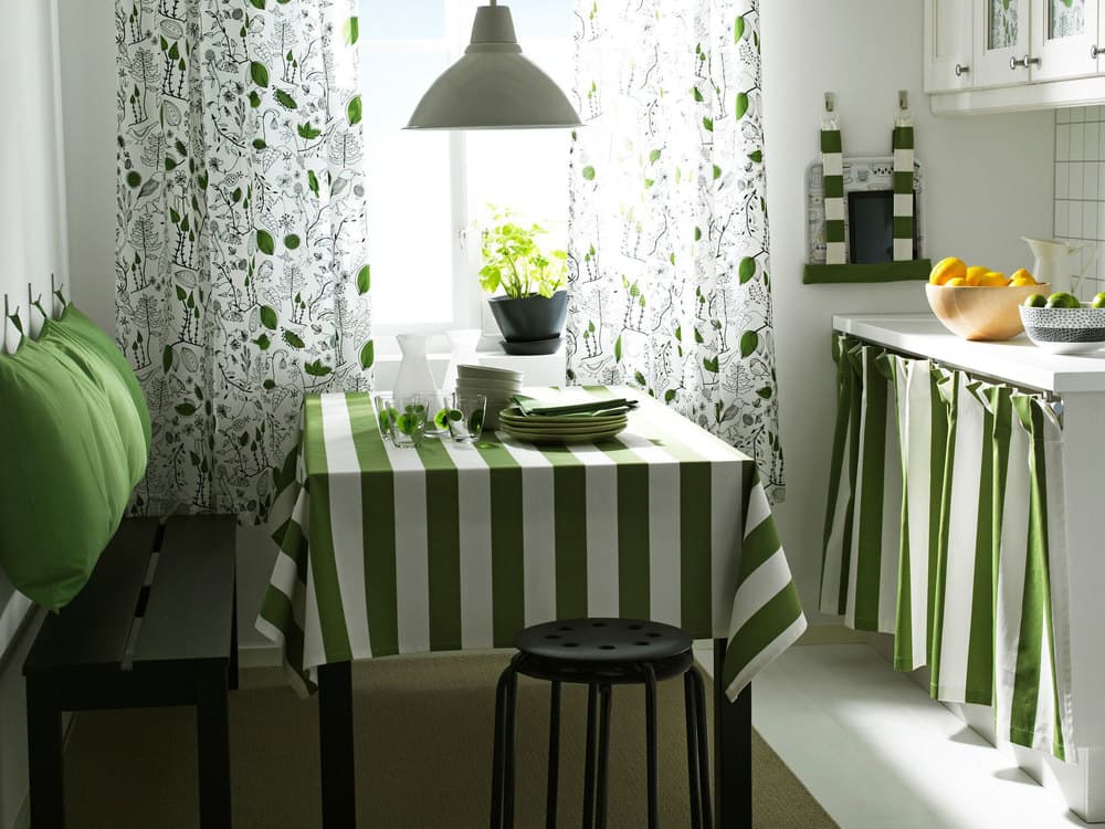 - текстиль должен быть практичным, чтобы его можно было легко стирать или чистить. Кухня, даже если она большая по площади, всегда будет местом повышенной влажности, копоти и грязи;