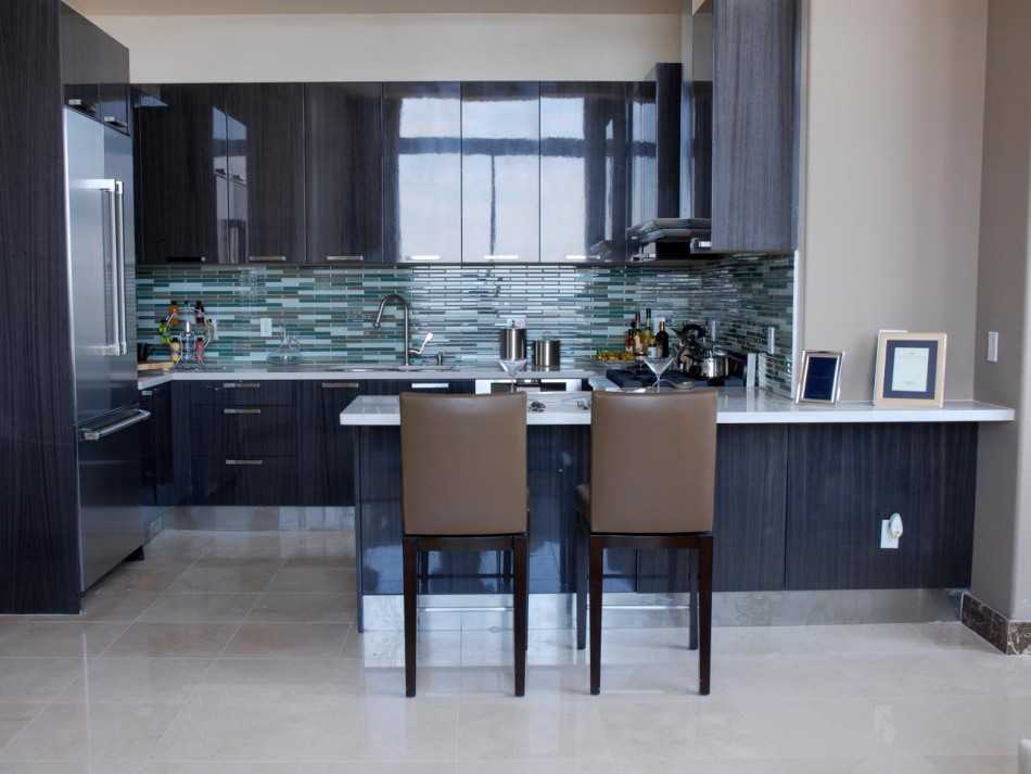 Противоположная сторона кухни будет свободна для размещения обеденного стола или барной стойки. На стене остается место для телевизора, а если он вам на кухне ни к чему, то можно предусмотреть дополнительные полки для полезных кухонных вещей.
