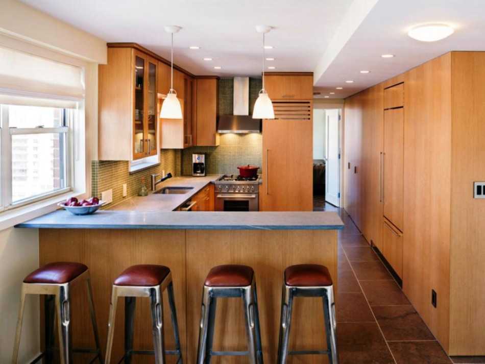 Если в квартире проживают 1-2 человека, стол можно заменить барной стойкой или обустроить под принятие пищи подоконник. Другие варианты – компактный круглый или раскладной стол.