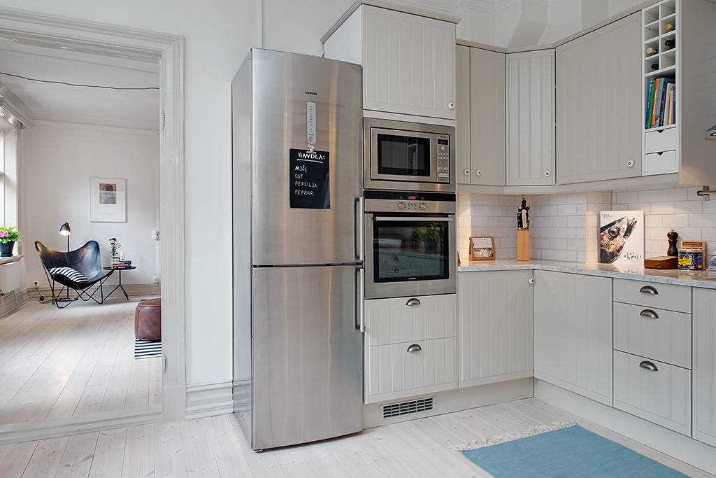 Другой вариант – поставить холодильник в окружении шкафов. Они будут казаться единым целым, и потому визуально сократят пространство, занимаемое им.