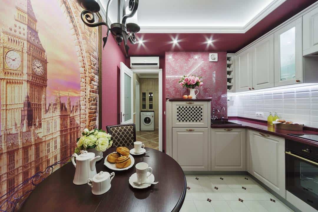 Вместо плитки можно применить панели из пластика. Оформление обеденной зоны заключается в использовании влагостойких обоев. Также можно поклеить фотообои с изображением городов или пейзажей.