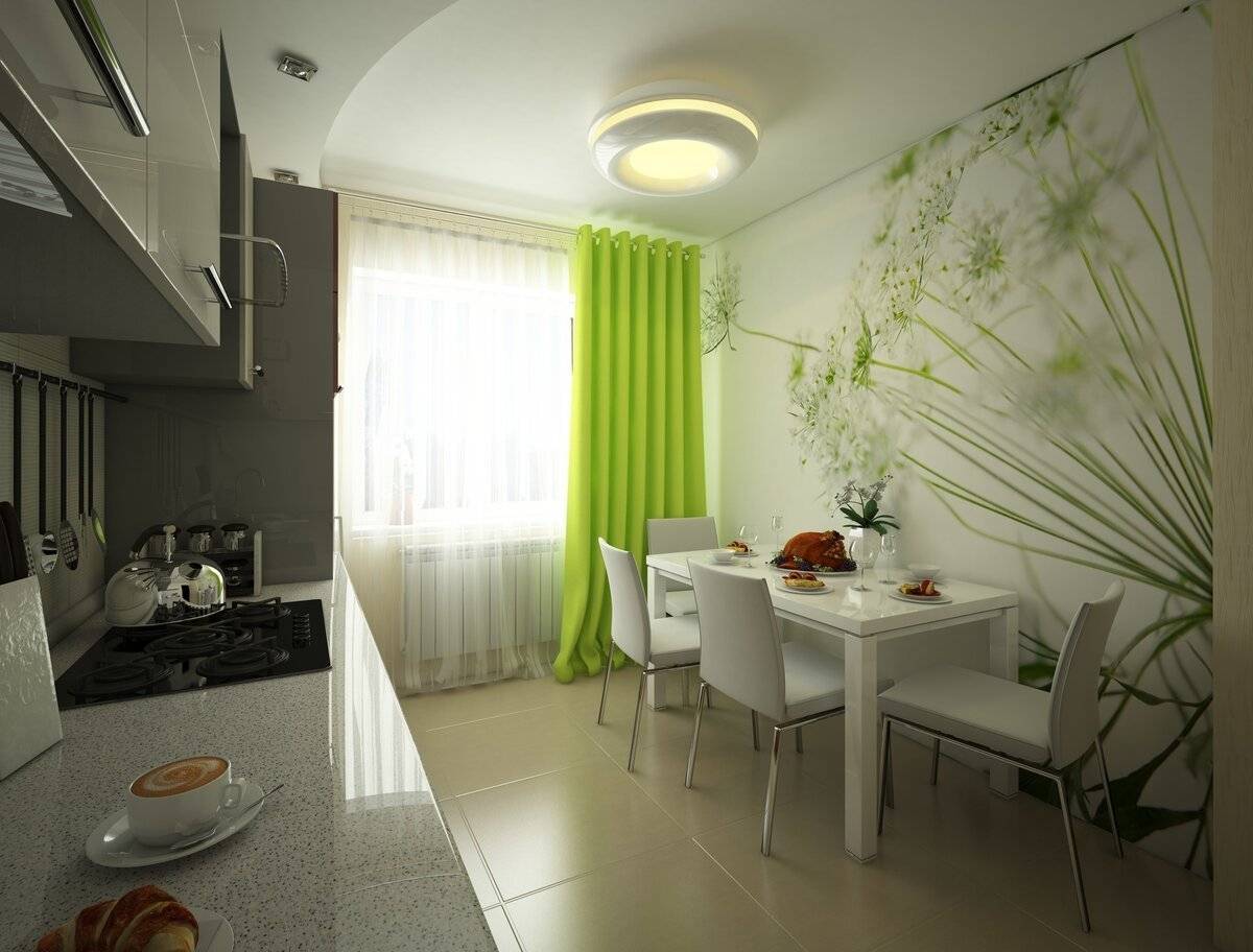 Во многих проектах место под окном задействуют посудомоечной или даже стиральной машинкой. Однако в кухне 9 кв типа ленинградка отсутствует большое окно. В комнате находится небольшой оконный проем, расположенный несимметрично, который очень сложно обыграть в плане декора. Поэтому желательно выбрать простое оформление в виде симпатичной занавески.