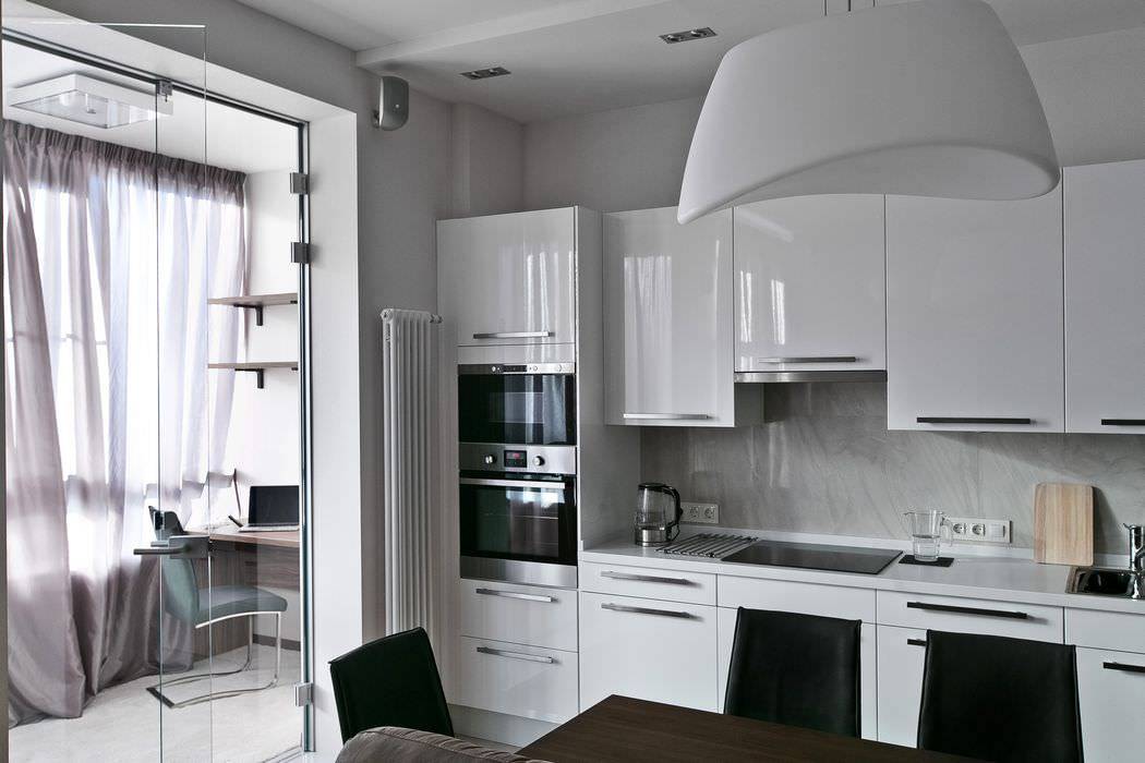 Бывают такие счастливчики, которым удалось получить панельный дом, с кухней где есть выход на лоджию или балкон. Если их слить в одну площадь, то получится выиграть до пяти метров дополнительной территории.