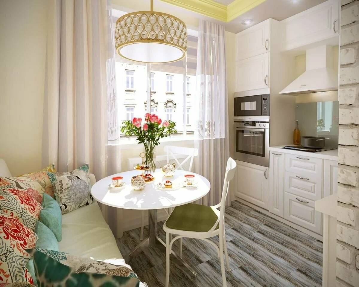 С одной стороны девять метров не позволяют слишком сильно развернуться с дизайном и выбором стиля для интерьера. Но с другой такая квадратура дает возможность спокойно распределить по комнате гарнитур, холодильник и кухонный стол со стульями.