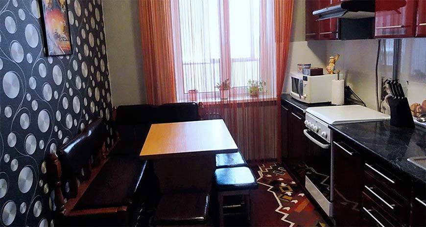 Их подбирают, принимая во внимание размеры стен. Тут же устанавливают и необходимые бытовые приборы, при этом противоположная зона помещения останется свободной для размещения диванчика и обеденного стола