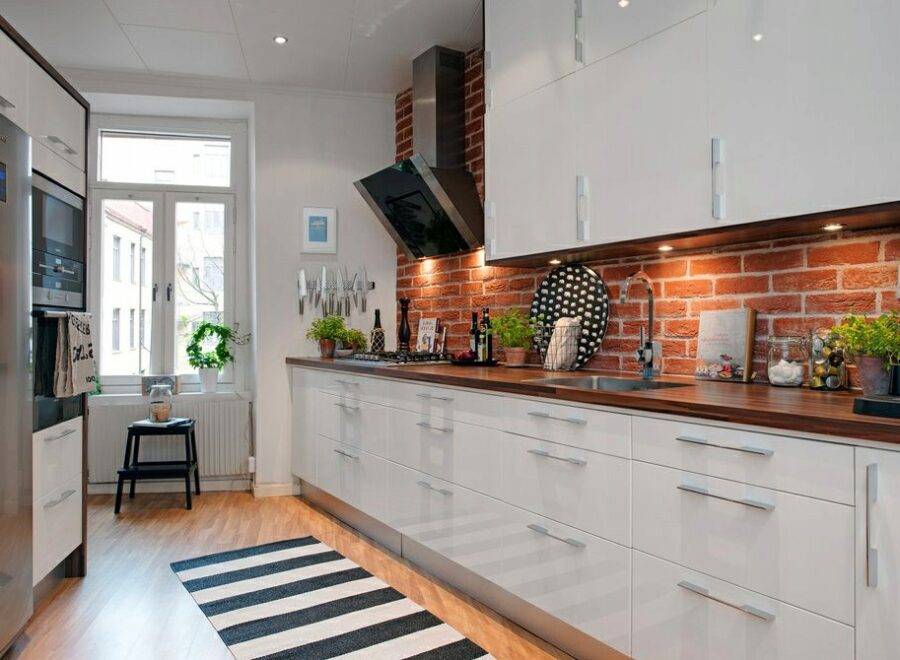 Пространство между верхними и нижними шкафами может быть отделано плиткой метро или плиткой в стиле ретро, красным кирпичом, а также архитектурным бетоном. Белая мебель и деревянные столешницы также будут хорошо выглядеть в компании с белыми стенами, выкрашенными обычной кухонной краской.