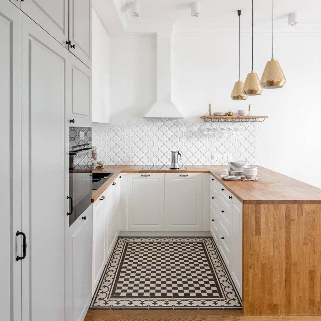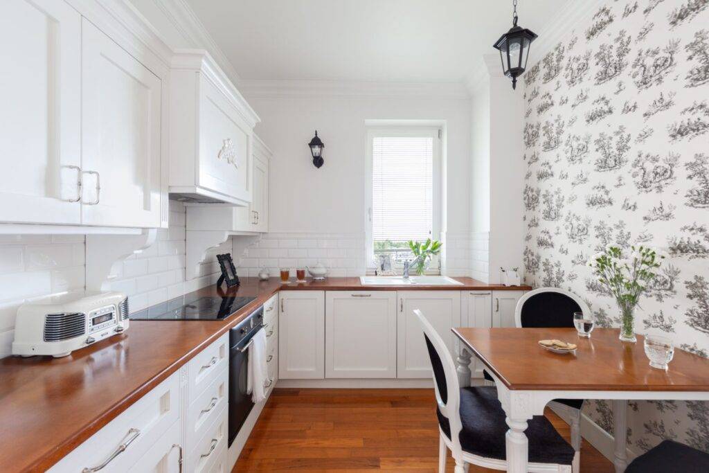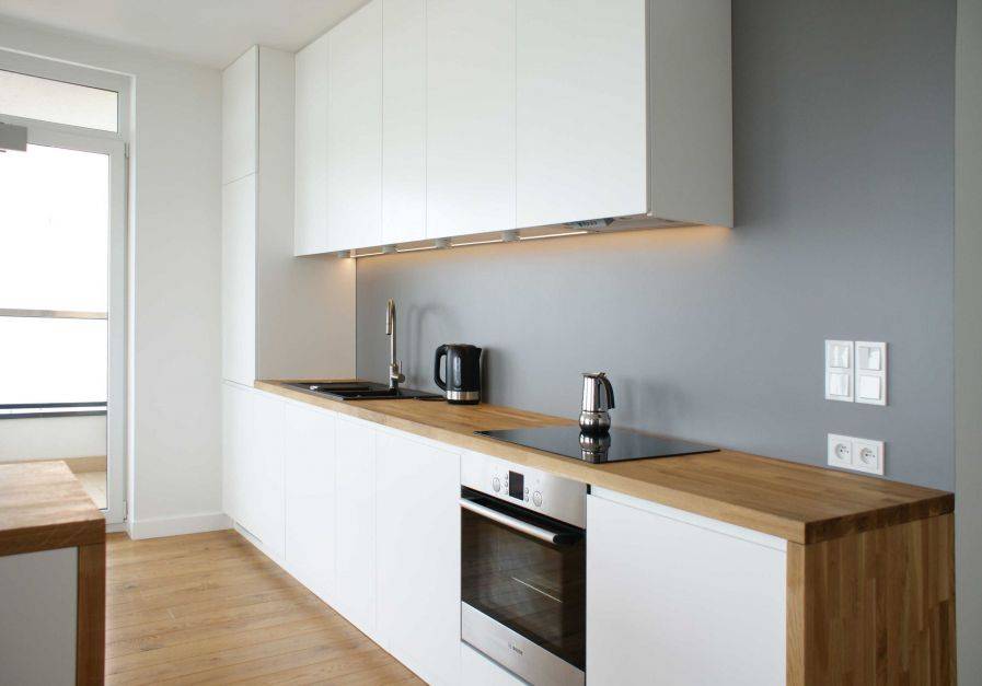 Какие стены подходят для белой кухни с деревянной столешницей?