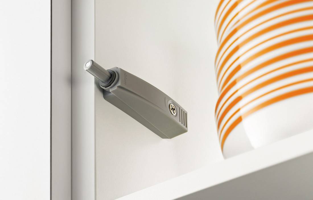 Устройства немецких разработчиков Hettich и Blum, которые называются «Push-to-Open»и «Tip-On», действуют по принципу нажатия. Для распашных дверей можно использовать мебельные петли со встроенным адаптером или накладные/врезные «толкатели».