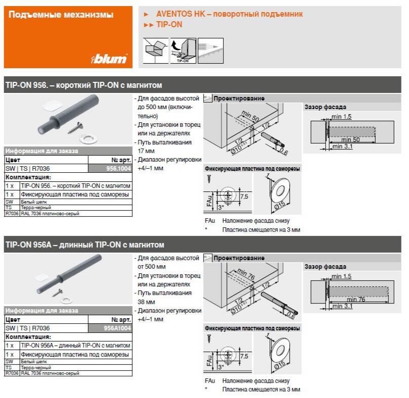 Различные варианты Push on мы рассмотрим на примере решений от компании Blum, только называются эти механизмы у них Tip-on.
