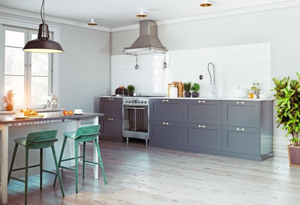 Отсутствие необходимости выбора места для шкафов упрощает выбор вариантов размещения напольной мебели, хотя в тесной кухне предпочтение обычно отдают линейному или угловому расположению. На большой или совмещённой с другим помещением кухне можно установить «остров» или барную стойку.
