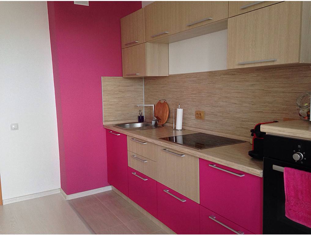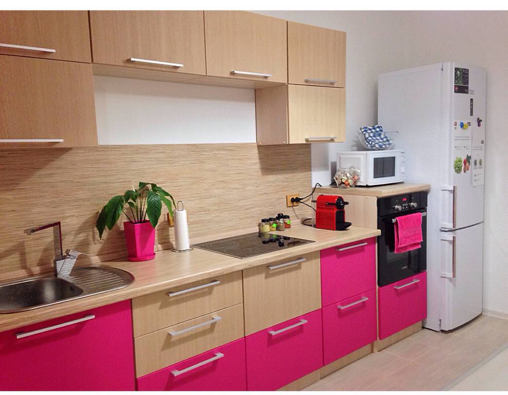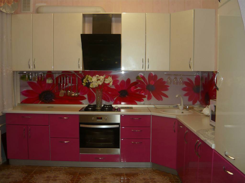 Фартук для розовой кухни рекомендуется сделать из обоев, плитки или при помощи краски. Фартук в данном случае является обязательным элементом, он позволяет разграничить пространство. Самым лучшим решением для розовой кухни будет светлый фартук: белый, бежевый, жемчужный и т.д.