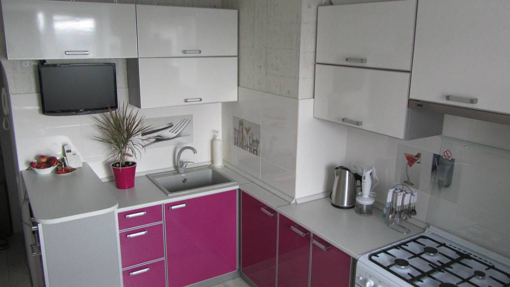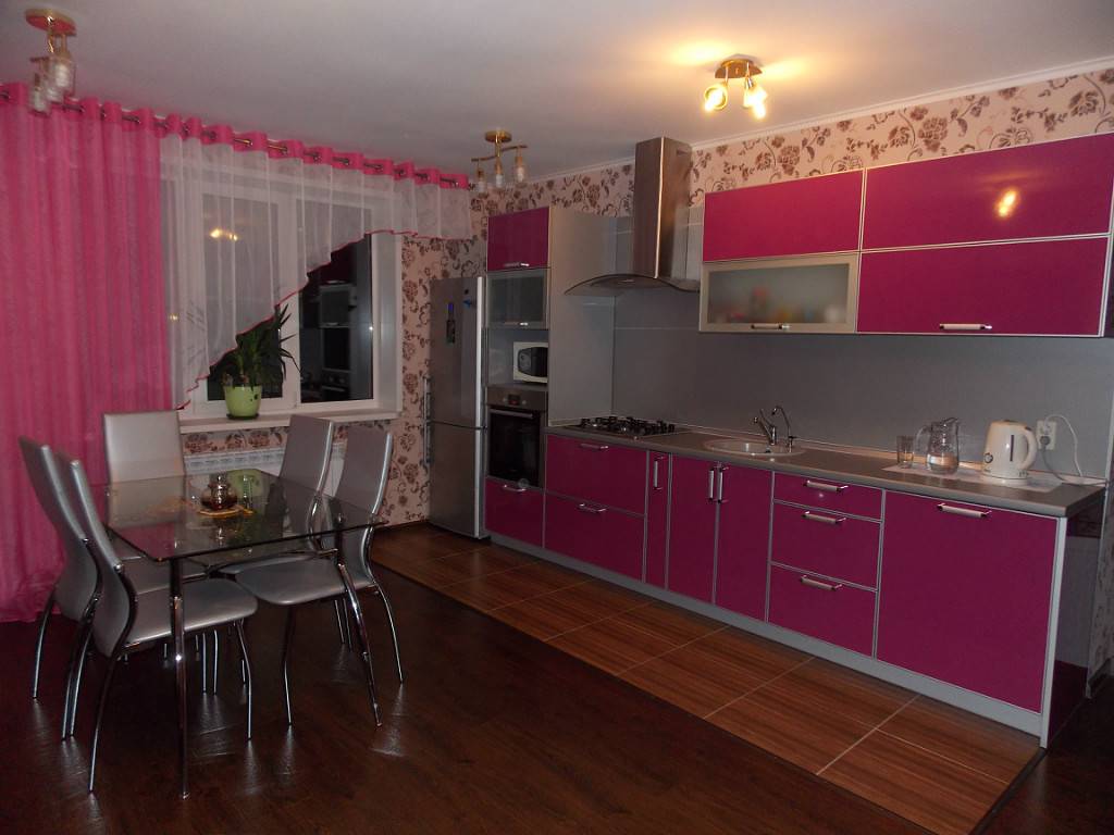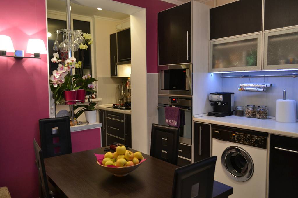 Классическое комбинирование в кухонной комнате: цвет фуксии с белым. Благодаря чистоте белого, пурпурный раскрывается, становится глубже и интереснее. С ним совмещаются все оттенки фуксии, от самых мягких до броских и сочных.