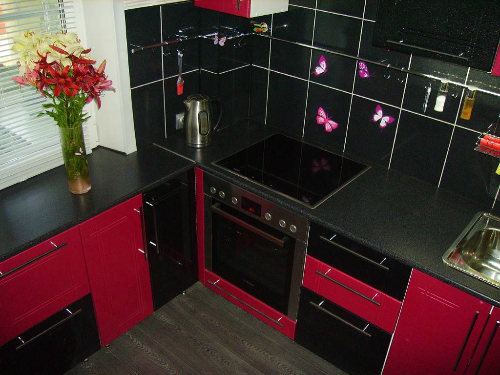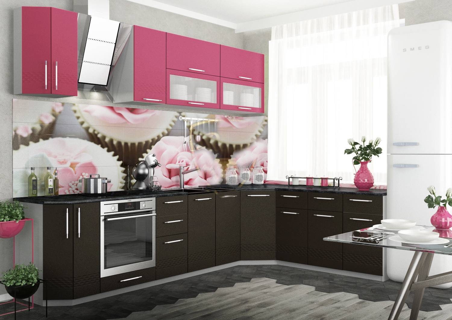 Потрясающе смотрится дизайн розовой кухни с занавесками черного, винного, бордового, малинового или темно-вишневого цвета. Для того, чтобы оживить пространство можно использовать полотна с принтами. Мелкие узоры добавят помещению непринужденный облик, а более крупные орнаменты наделят его строгостью и солидностью.