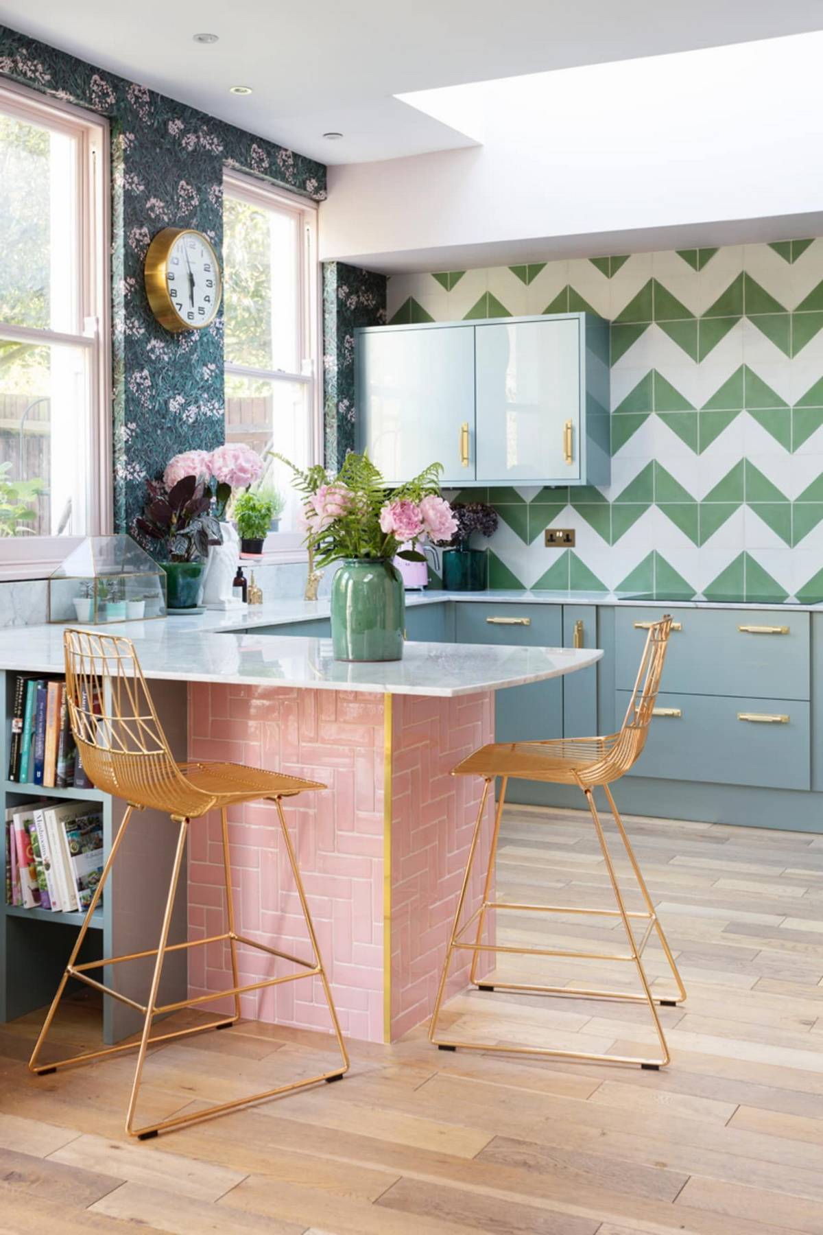 В цвете оформляют как гарнитур, так и стены, фартук, стулья