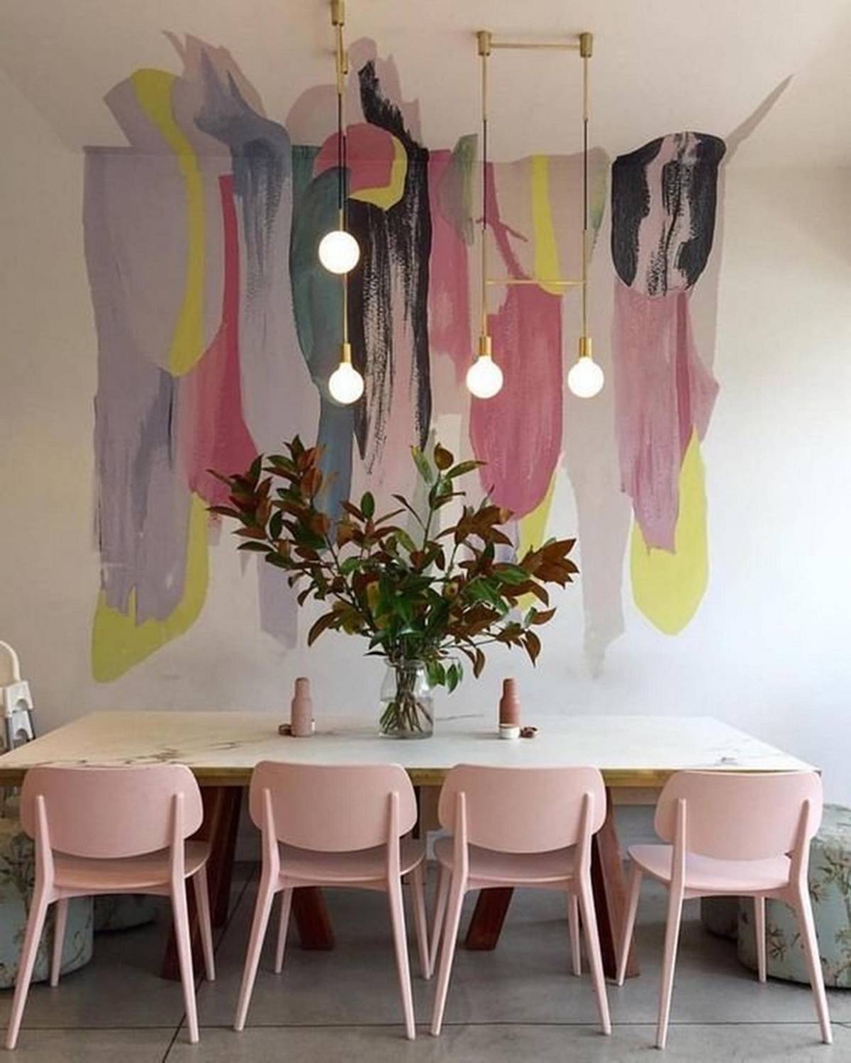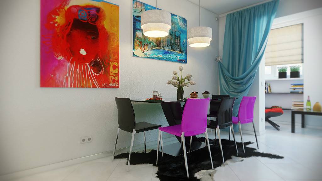 К примеру, намного выгоднее выглядят светло-зеленые стулья на фоне стены цвета фуксии. Здесь главное правильно выбрать комбинацию: оттенки должны согласоваться, а не перечеркивать друг друга.