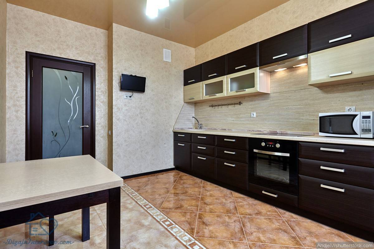 Венге-кухня отлично сочетается с цветом «беж». Темный гарнитур здесь размещается на светлом фоне, интерьер выходит максимально спокойным, потому требуется добавить несколько ярких акцентов. Иногда фасады шкафчиков, а также полы украшаются мозаикой в коричнево-бежевых тонах – рисунок обычно представляет собой простую геометрию.