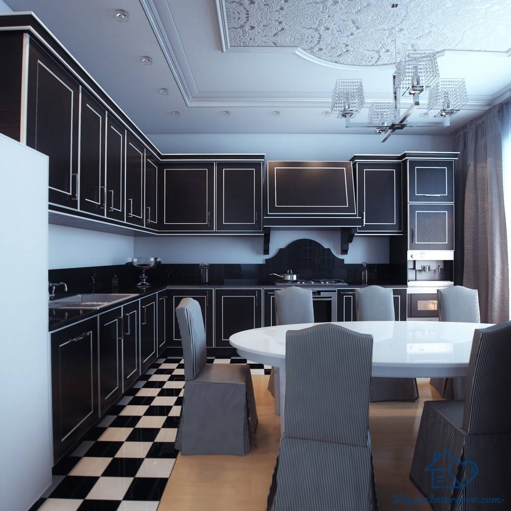 Пол для подобного интерьера делают из ламината или выкладывают плиткой тех же оттенков в шахматном порядке. Стены покрывают светлым оттенком бежевого. Для оконного проема подбирают шоколадные шторы. Для обеденной группы используют стол и стулья с темными основаниями и светлой столешницей. В декоративном плане также стараются сочетать эти два цвета так, чтобы они поддерживали друг друга.