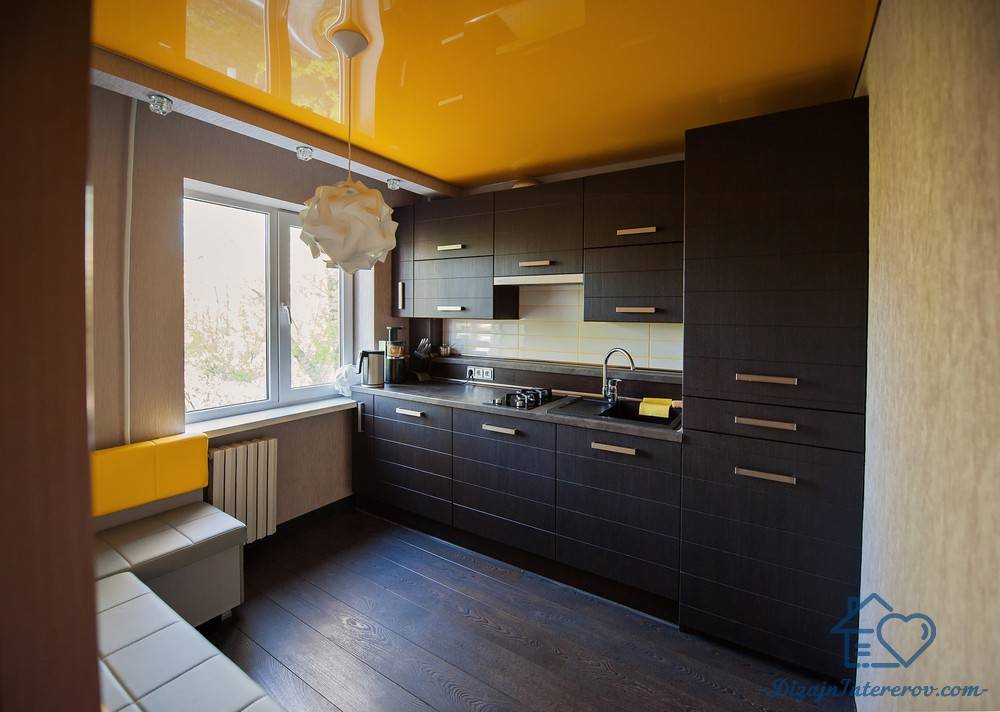 Для кухни венге потолочная поверхность не должна быть слишком активной. Это говорит о том, что оптимальными вариантами станут натяжные матовые конструкции белого или сливочного цветов. Они могут содержать несколько уровней или быть идеально ровными. Дополняется такой потолок необходимым для лучшей освещенности количеством точечных светильников или центральной люстрой.