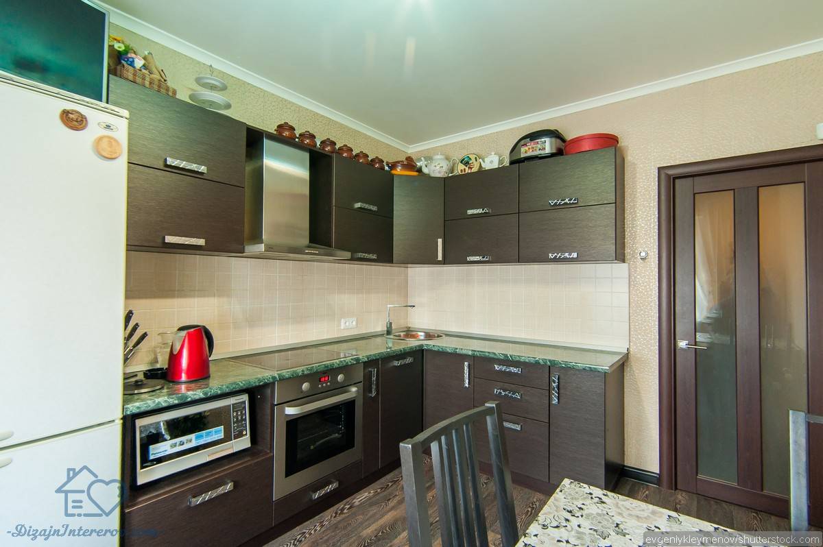 Сочетание с различными оттенками зелени, напоминает природе – коричневая земля с зеленой растительностью. Фасады гарнитура здесь оформляются зеленым, а черно-коричневыми, кофейными будут полы, дверные проемы, столешницы. «Зеленый уголок» создают и в обеденной зоне – его оформляют фотообоями, выполненными в соответствующих тонах.