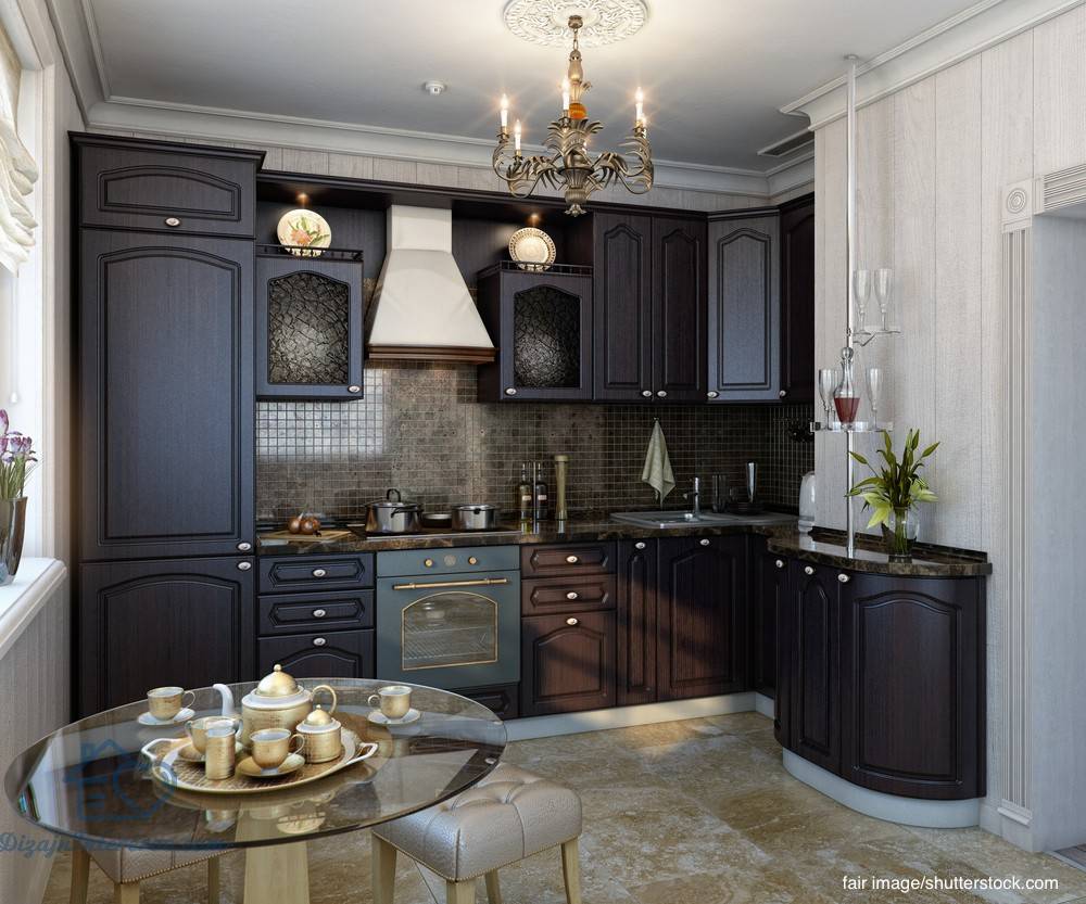 Это универсальный стиль, который никогда не выходит из моды. Он предполагает наличие белых, бежевых, коричневых цветов. Как правило, в кухнях, оформленных в классическом стиле, белый потолок, бежевые или светло-кофейные стены, светлый пол. В этот дизайн идеально впишется мебель из массива венге. Мебельные гарнитуры лишены вычурности, они практичны, удобны. Для каждой вещи предусмотрено здесь своё место. Классический дизайн смотрится дорого и солидно, однако кухня для него не может быть маленькой. На небольшой 6-метровой кухне такой набор мебели будет выглядеть громоздко.