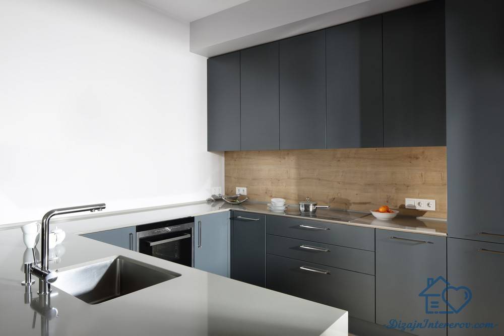 Вопрос выбора цвета столешницы и фартук решается просто, если нижний ряд фасадов выполнен под дерево. Тогда рабочие поверхности подбираются в тон, а верхние шкафы могут быть любого ванильного оттенка.