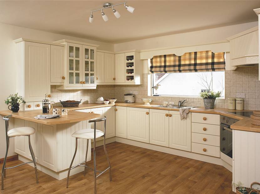 Вопрос выбора цвета столешницы и фартук решается просто, если нижний ряд фасадов выполнен под дерево. Тогда рабочие поверхности подбираются в тон, а верхние шкафы могут быть любого ванильного оттенка.