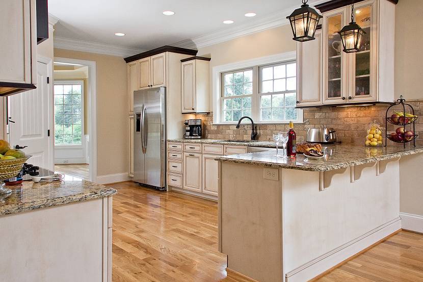 Имеет много общего с классическим стилем, однако включает в себя некоторые дополнительные элементы. Например, белый потолок, а на нем балки цвета венге. Кухонная мебель этого же цвета хорошо впишется в общий дизайн помещения.