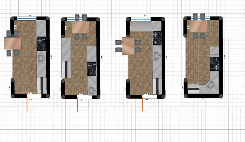 - Прямоугольник №1 (ширина – 3,5 м, длина – 4 м) – самое удобный вариант. Комплект корпусной мебели можно ставить буквой «П» (в зависимости от расположения дверей), «Г» или вдоль одно стенки. Напротив него – обеденная зона – стол, сиденья или стулья.