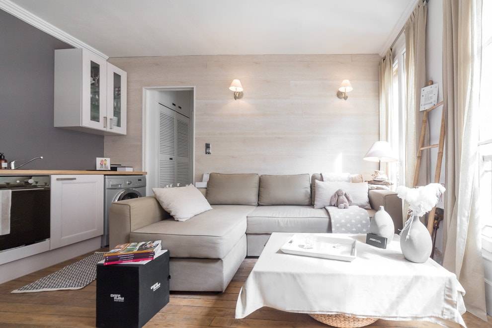 Планирование пространства на столь ограниченной площади подчиняется простым законам лаконичности, функциональности, эргономичности. В такой комнате присутствует как минимум две зоны — кухня и непосредственно гостиная, но может быть включена столовая. Хотя для нее остается совсем мало места, поэтому вместо обеденной группы часто используют барную стойку, полуостров — это лаконичная альтернатива столовой, которая одновременно служит инструментом зонирования.