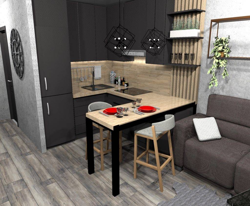 Если семья большая, уместен будет полноценный обеденный стол и стулья с высокими спинками. Но если в доме проживает 1-2 человека, достаточно установить барную стойку, которая будет служить обеденным пространством и поможет сэкономить свободное пространство.
