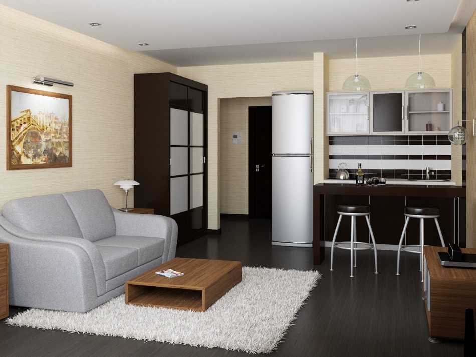 Для того чтобы не загромождать интерьер лишними предметами, можно зонировать комнату с помощью мебели. Идеальным вариантом является барная стойка. Такой предмет не только практичен, но и функционален. Стойка визуально отделяет область отдыха от рабочего места.