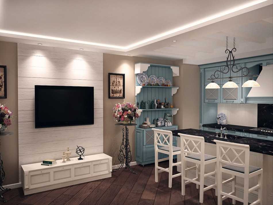 Для выделения одной из частей кухни-гостиной 19 кв. м, на её территории можно сделать натяжной или навесной потолок. Располагаться он будет ниже, чем потолок другой части комнаты, для отделки которого можно использовать штукатурку и краску. Эффектно смотрится натяжной или навесной потолок яркого цвета.