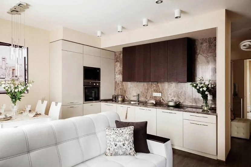 В совмещенном помещении, зона готовки должна выглядеть максимально незаметно, чтобы комната не воспринималась в качестве одной большой кухни. Для этого выбирают гарнитур со светлым или нейтральным фасадом, гармонирующим с отделкой стен. Таким образом конструкция сливается с окружающей обстановкой и не загромождает пространство. Чтобы еще больше облегчить внешний вид мебели, закрытые верхние шкафы оформляют стеклянными вставками или заменяют полками.