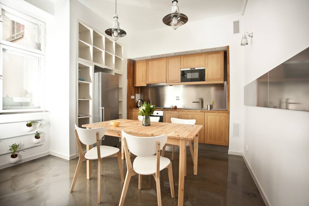 - в квартирах с небольшой кухней путем соединения ее со смежной комнатой можно оборудовать обеденную зону вместе с рабочей, это упрощает процесс сервировки и подачи блюд, также создает органичную атмосферу всего пространства;