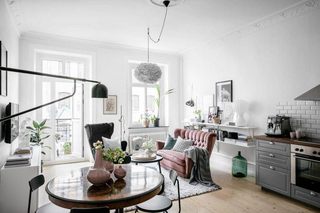Актуальный, практичный, уютный и недорогой в реализации современный стиль дизайна — идеален для кухни-гостиной. Для яркости цвета добавляются текстилем и мебелью. Белый, серый и дерево в отделке — база. Грязно-розовый, грязно-голубой и горчичный — акценты. Интересный стиль без китча.