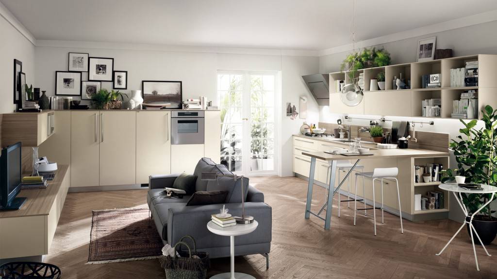 - запахи и звуки рабочего кухонного процесса проникают в зону отдыха гостиной. Данную проблему можно лишь частично решить за счет установки вытяжки с высокой мощностью, также можно применять бытовую технику с минимальным уровнем шума;