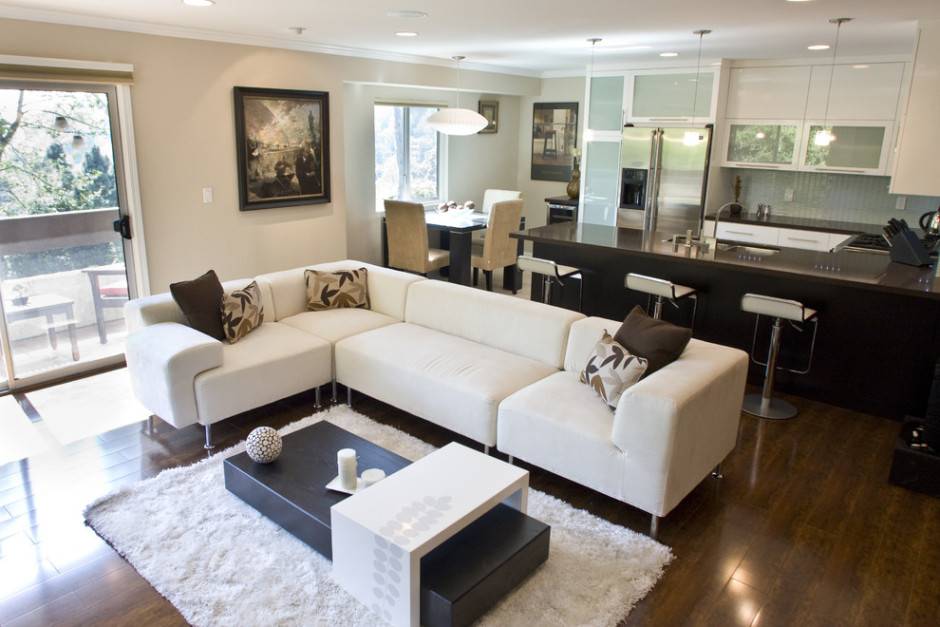 Идеальный фундамент для реализация других современных стилей дизайн в кухне-гостиной.