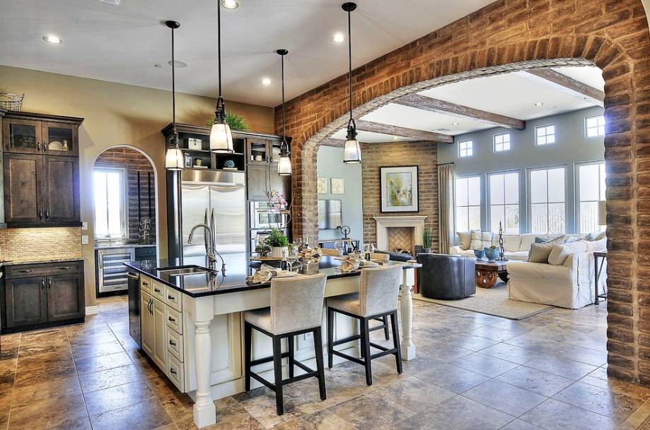 Расширенный проем между кухней и гостиной можно оформить в виде арки. Но по сравнению с 1990-ми и 2000-ми годами их вид поменялся. Сегодня актуальны вытянутые в высоту арочные проемы, без массивного оформления в форме камня или дерева.
