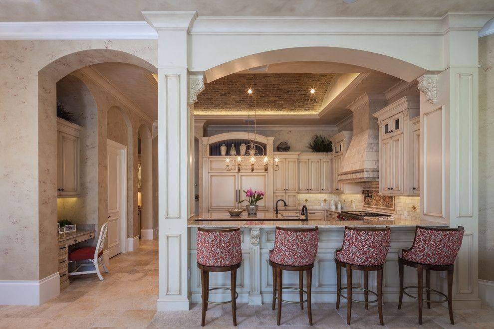 Арка помогает также создать оригинальный дизайн с зонированием пространства, что необходимо в просторных помещениях для лучшей ориентации. Оставленные участки стены частично скроют кухню от посторонних глаз – ещё один весомый «плюс» с эстетической точки зрения. В арочном проёме можно обустроить барную стойку – получится стильно и практично.