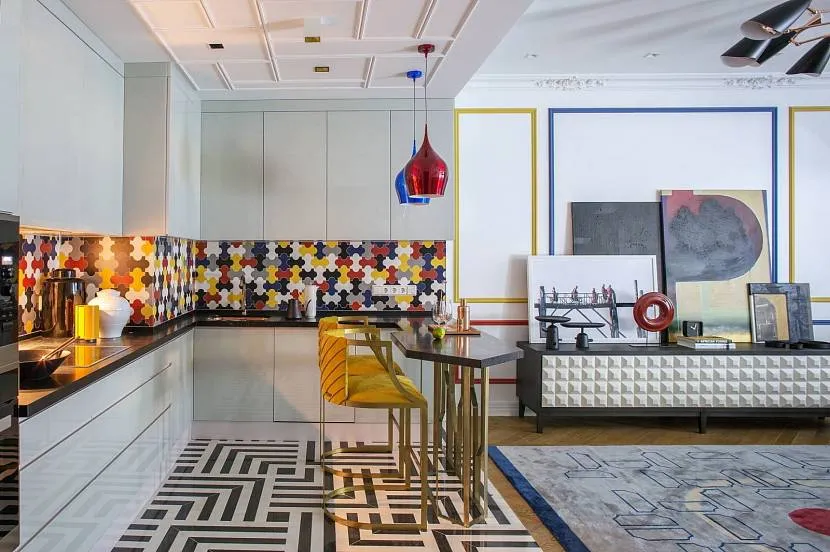 Особенность – акцент по центру помещения. Можно сделать там обеденную группу или диван, а также дополнительное освещение. В таком дизайне актуально будет смотреться ступенчатый потолок, мраморный пол, фартук черно-белого окраса и стулья в форме геометрических фигур.