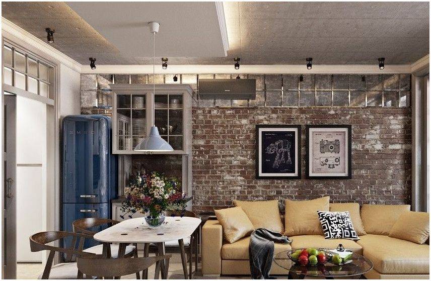 Идеален для объединенной кухни-гостиной. Не нужно скрывать технические элементы, например, кирпичную кладку. Стиль предполагает неоднородные поверхности, вдоль которых струится свет, создавая объемные тени.
