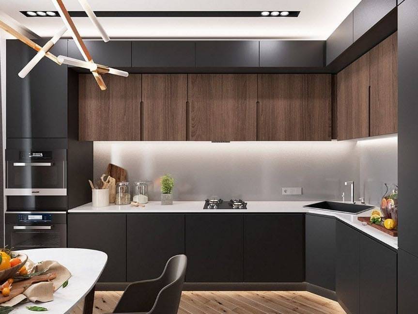 Прямой угол актуален для небольших помещений, а вот закругленная мебель позволит создать там место для готовки.