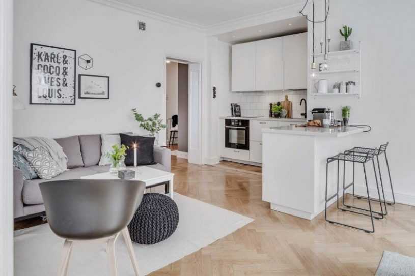 Для очень маленьких кухонь (меньше 9 м кв.) лучше всего объединить помещения и сделать кухню-гостиную в скандинавском стиле. Разделить пространство на зоны лучше всего с помощью легкой барной сто
