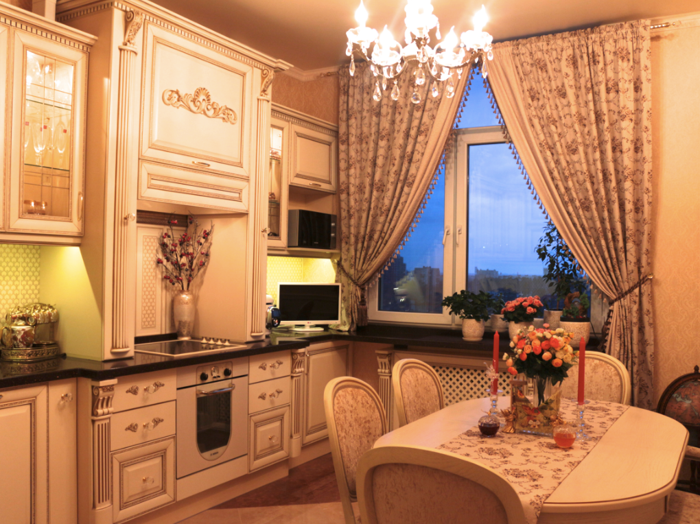В стиле классика применяют натуральные материалы, такие как, мрамор, дерево и камень. Пол в основном выкладывают паркетом или плиткой с четким рисунком. На потолочной плоскости присутствует декоративная лепнина. В помещении выполняется линейная или угловая планировка с симметричным расположением мебели и техники.