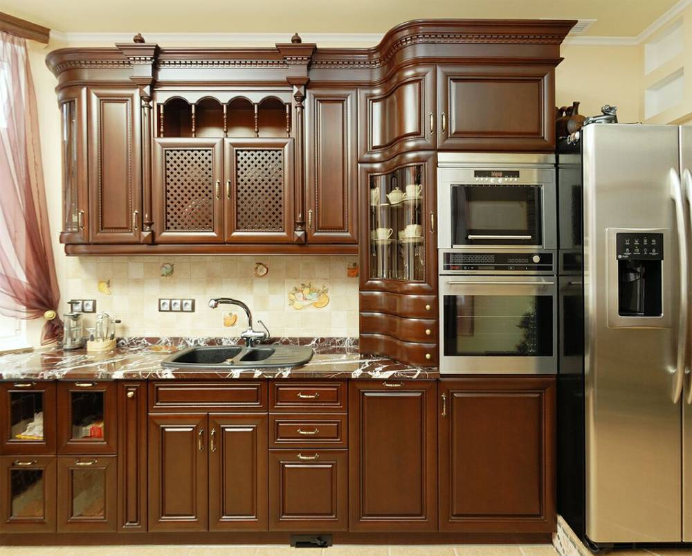 Кухни в классическом стиле отличаются обычно рыжая или темная. Фасады с декоративной фрезеровкой или витражными рисунками на стеклах. Столешница лучше всего под камень.