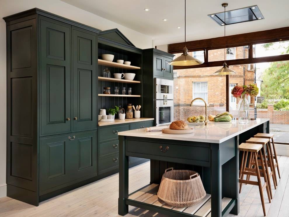Самыми надежными и прочными являются кухни из дерева твердых пород, таких как дуб, ясень, бук или же черешня.
