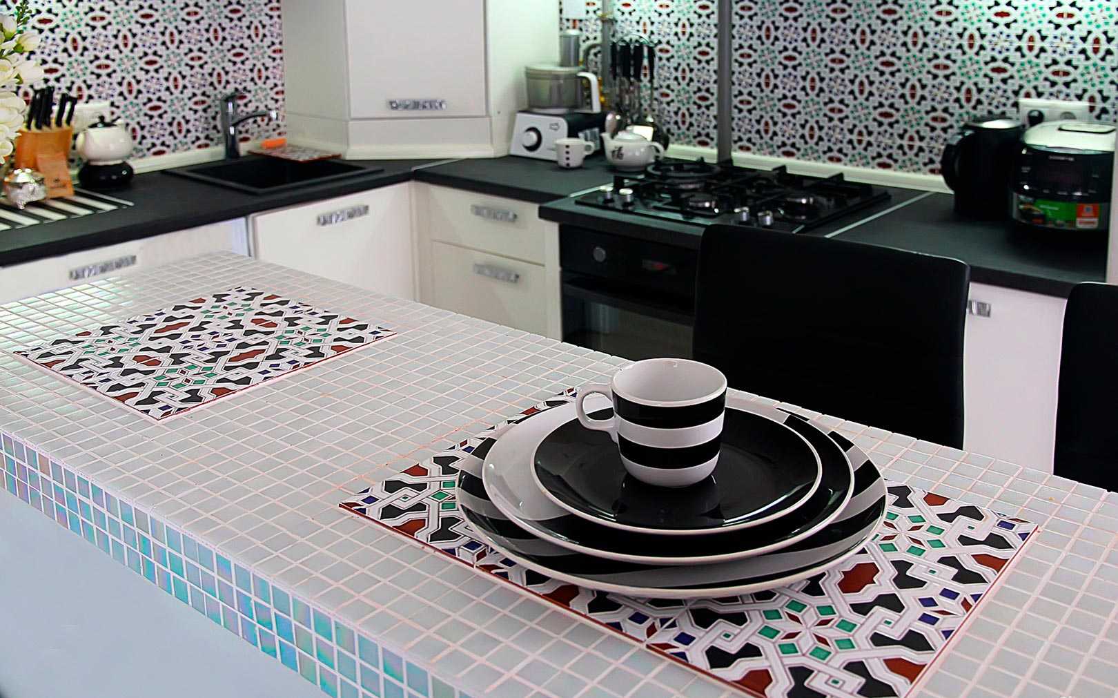 Перед ее укладкой очень важно составить план, где она будет располагаться на столешнице. Лучше постараться распределить целую плитку с краю, а ее часть в середине