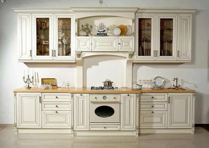 Отлично будут смотреться такие декоративные элементы, как гнутые ножки, резьба, позолота. Бытовую технику, насколько это возможно, необходимо спрятать за деревянными фасадами.