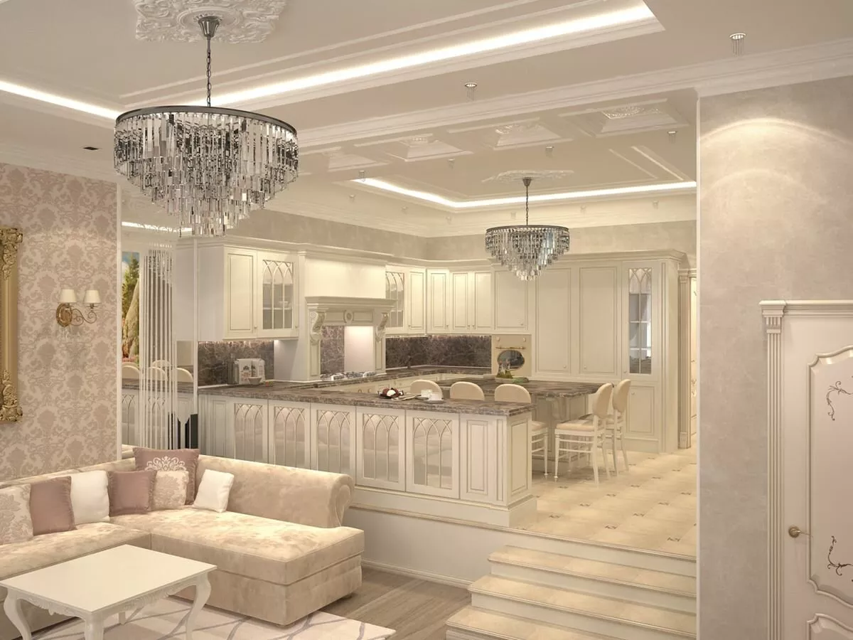 Угловая кухня в классическом стиле подразумевает наличие барной стойки, в которой хранятся бокалы или другие кухонные принадлежности. Дизайнеры предлагают варианты с объединением кухни и гостиной в классическом стиле. Оттенки, используемые в стиле, — светлые и древесные.