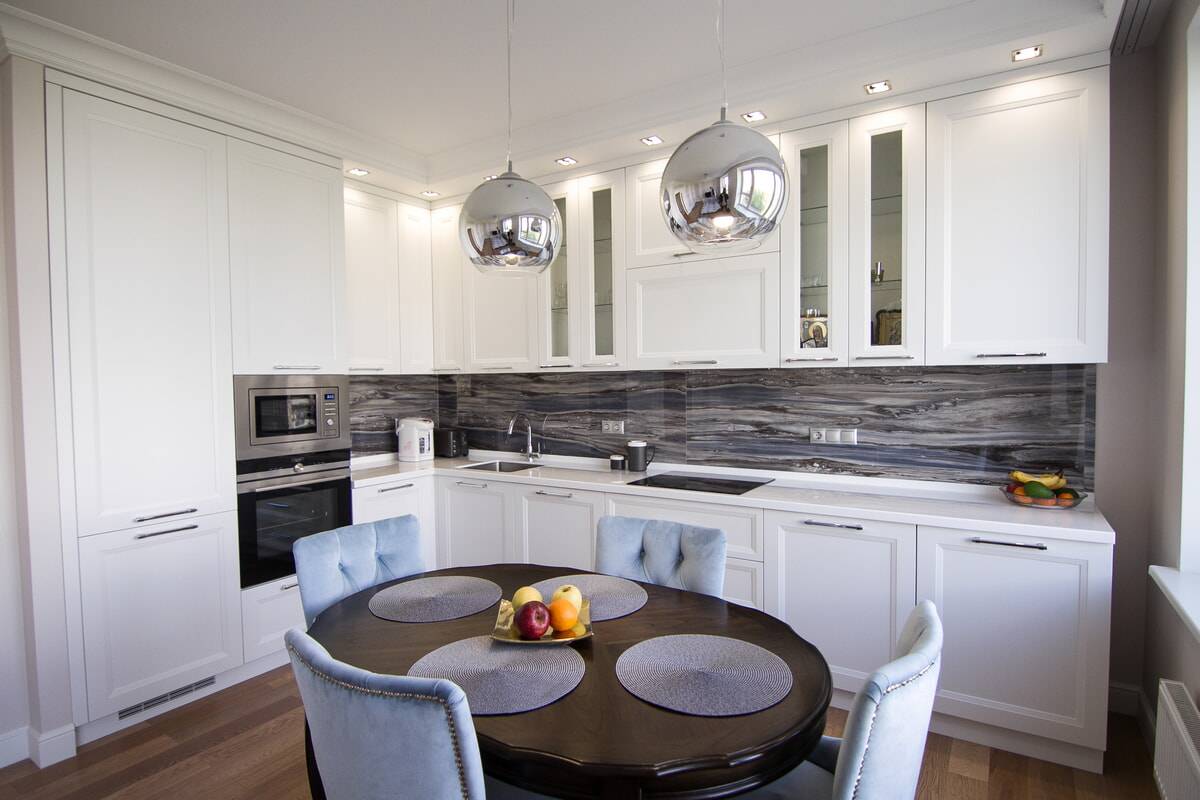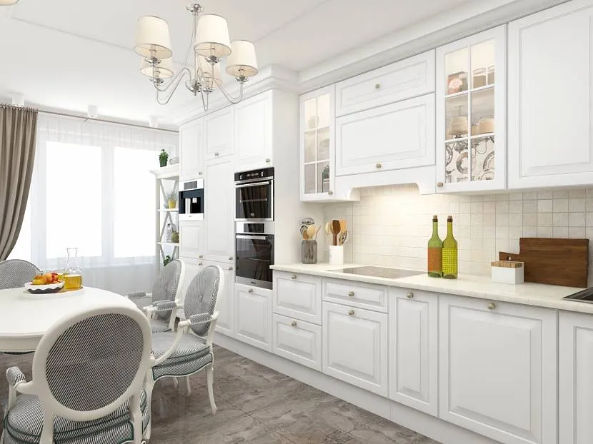 Для неоклассики характерны матовые фасады в светлых оттенках. Мебель выбирается по принципу функциональности и комфорта. Бытовая техника встраивается в фасад кухни.